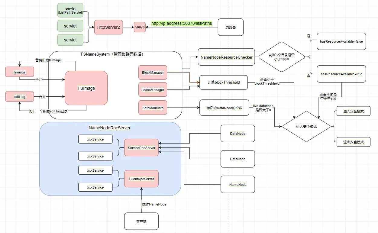 它对外提供一个50070的端口,浏览器发送一个http://ip address:50070/listPaths的请求去请求servlet后,就会返回那个web页面了