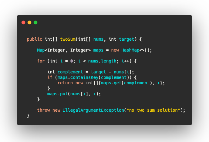 在进行迭代并将元素插入到表中的同时,我们还会回过头来检查表中是否已经存在当前元素所对应的目标元素。如果它存在,那我们已经找到了对应解,并立即将其返回。