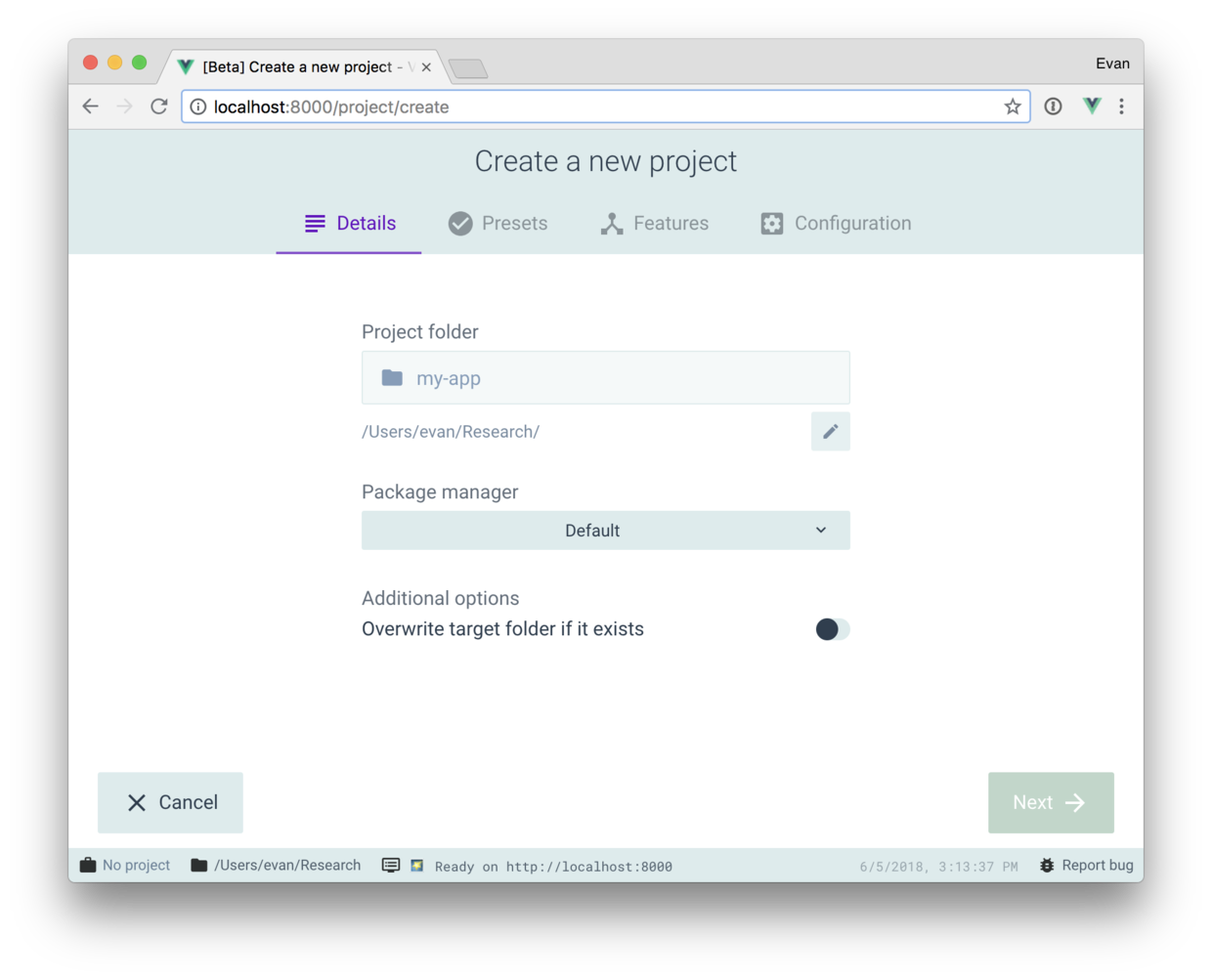 安装过程也发生了一些变化,配置可以保存,下次可以再用,像前面的 vue-webpack4。