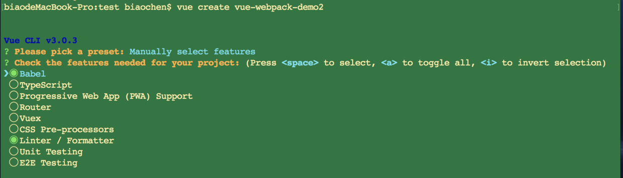 - 再来手动的,我起的项目名字叫 vue-webpack-demo2,如下图,让你选择那些选项,按 空格键 是选择单个,a 键 是全选。