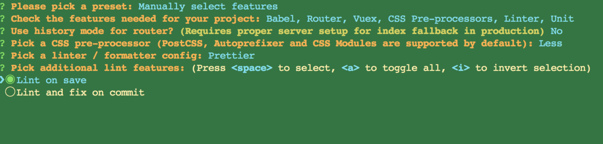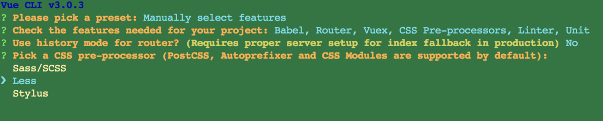 - 会让你选择默认(default)还是手动(Manually),(注:现在vue-cli3.0默认使用yarn下载)。