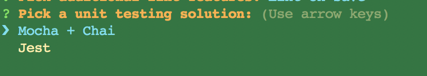 - 选择单元测试解决方案,Mocha是流行的JavaScript测试框架之一,通过它添加和运行测试,从而保证代码质量,chai 是断言库,我两个都选择了。
