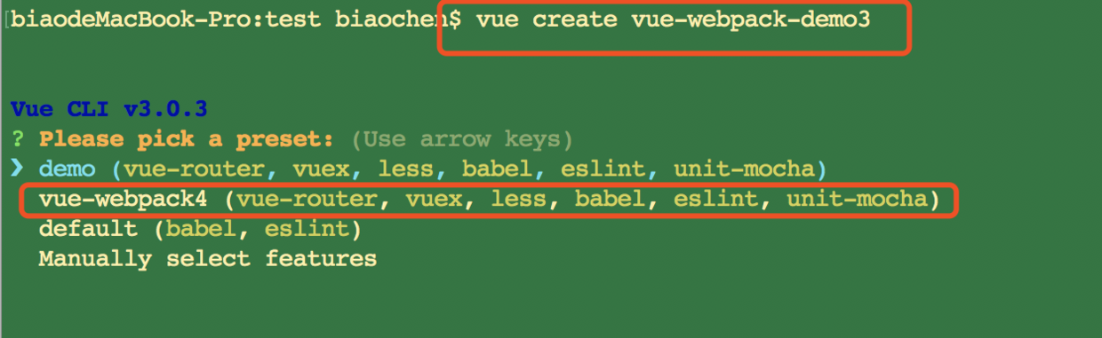 - 再创建项目的时候,刚刚配置好的选择的名字 vue-webpack4 会这样子出现: