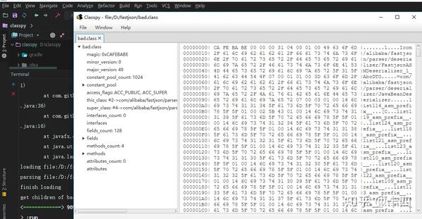 然后去执行,操作完毕后,我们去找到bad.class。idea中关于读字节码的插件有很多,像ASM等,这里我们要介绍另外一种好用的工具classpy,该作者写过《自己动手写Java虚拟机》。我们按照classpy的操作,打开bad.class文件(如下)