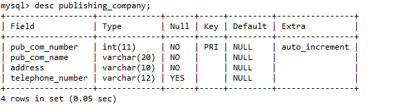 CREATE TABLE publishing_company( pub_com_number INT PRIMARY KEY auto_increment, pub_com_name VARCHAR(20) NOT NULL, address VARCHAR(10) NOT NULL, telephone_number VARCHAR(12) );- 上面语句运行后的结果