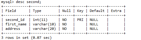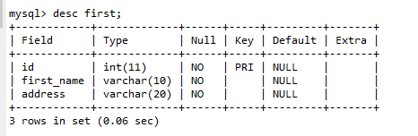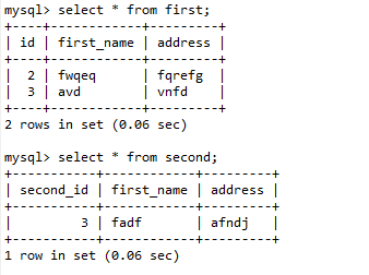 mysql> select * from first; +----+------------+---------+ | id | first_name | address | +----+------------+---------+ | 1 | gjirgje | fajifas | | 2 | gjagrt | gkjoig | +----+------------+---------+ 2 rows in set (0.08 sec) -