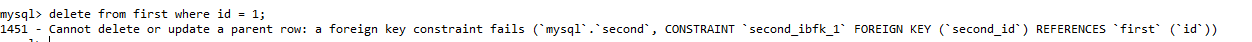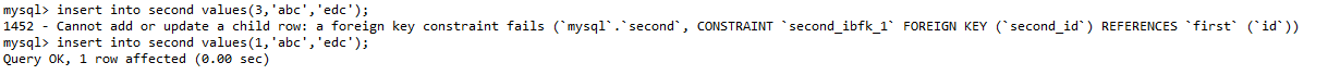 在子表中插入记录,但是待插入记录中外键索引的列的值在主表中不存在,那么将无法插入成功,通过下图可看出确实是这样子,其中插入的表second的id列的值为3,但是fisrt表中并不存在id值为3的记录,此时插入将失败