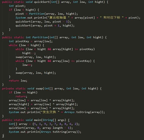 发生交换 [5, 1, 2, 3, 7, 4, 8, 6, 9] 发生交换 [5, 1, 2, 3, 4, 7, 8, 6, 9] 发生交换 [4, 1, 2, 3, 5, 7, 8, 6, 9] 算出枢轴值 5 和对应下标 4 发生交换 [3, 1, 2, 4, 5, 7, 8, 6, 9] 算出枢轴值 4 和对应下标 3 发生交换 [2, 1, 3, 4, 5, 7, 8, 6, 9] 算出枢轴值 3 和对应下标 2 发生交换 [1, 2, 3, 4, 5, 7, 8, 6, 9] 算出枢轴值 2 和对应下标 1 发生交换 [1, 2, 3, 4, 5, 7, 6, 8, 9] 发生交换 [1, 2, 3, 4, 5, 6, 7, 8, 9] 算出枢轴值 7 和对应下标 6 算出枢轴值 8 和对应下标 7