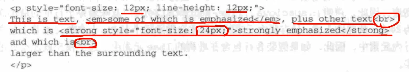 - 行高12,继承给下面所有元素。对于strong,line-height和font-size之差是-12px,除2确定半间距。再分别增加到内容区的顶部和底部,得到行内框。行内框12px。