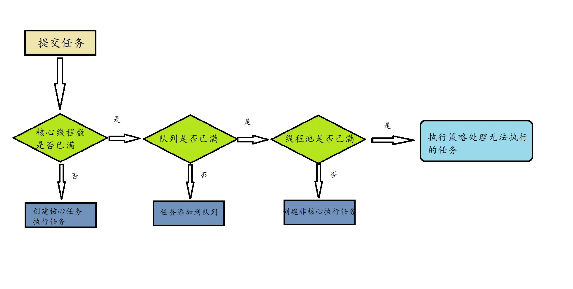 将创建返回ThreadPoolExecutor对象的线程池比作社区诊所、区卫生所、区医院,那么就可以很直观的发现;诊所只有一个医生,诊所内有一张长凳;区卫生所,有固定多个医生值班,卫生所内有一排排长椅;区医院门诊部,有多个医生值班,当病人很多时候还可以再请求科室医生下来再使用几个诊室,门诊候诊区外面有很多的长椅。当医院门诊部接收到医院内部通知,院内所有床位已用尽,等候区也已经饱和。这时开始执行拒绝措施:要么将问题不大的病人办理出院,空出位置;要么在门诊门口贴出告示,请病人到其他医院就诊,本医院已经饱和;要么直接不接收新的病人,让救护中心不要再送病人入院;要么暂时关闭门诊部,不再运行门诊,等到院内资源释放,再运作。