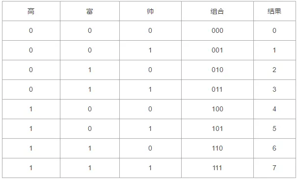 这样一来,我们就可以用一个变量,大小为0~7,简单高效地描述高富帅的情况。