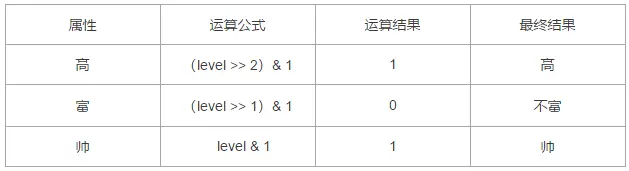 方法二:我们将高富帅分为3个属性:高,富,帅,每个属性值用0或1来表示,取它们的组合,二进制转换成十进制,就有0~7的数据范围。详情如下表1: