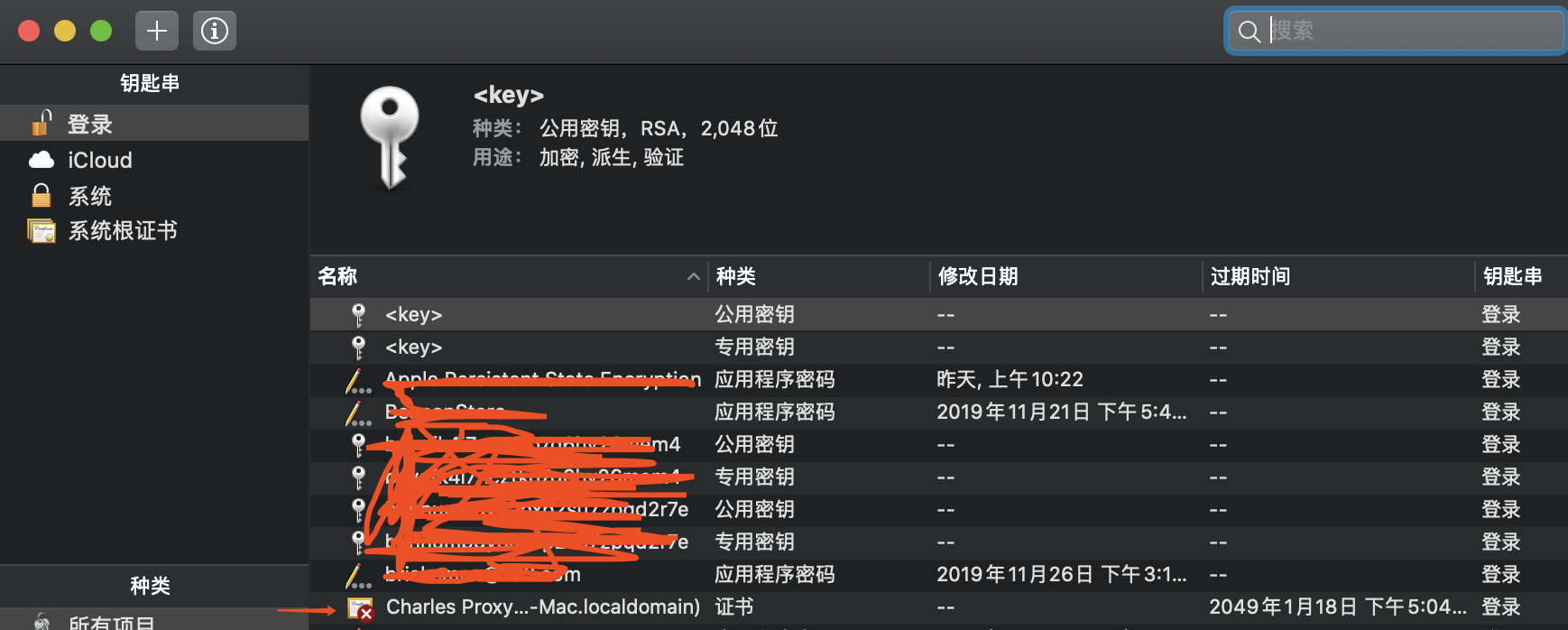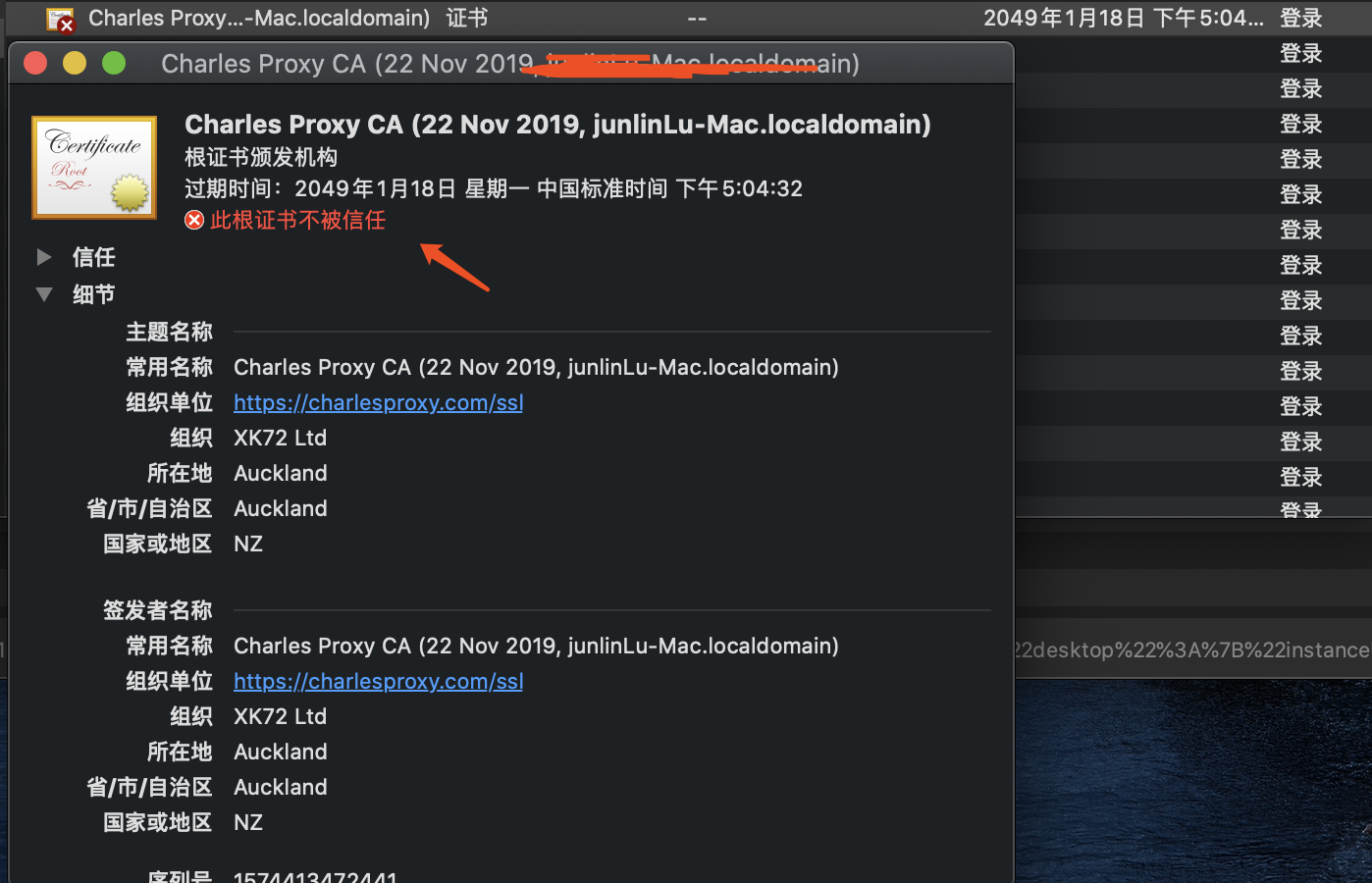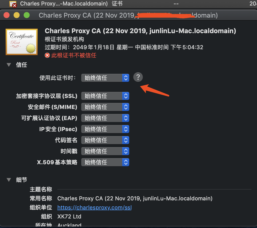 如上图所示,Charles Proxy..证书前面有一个红色的x,需要用户给予权限。