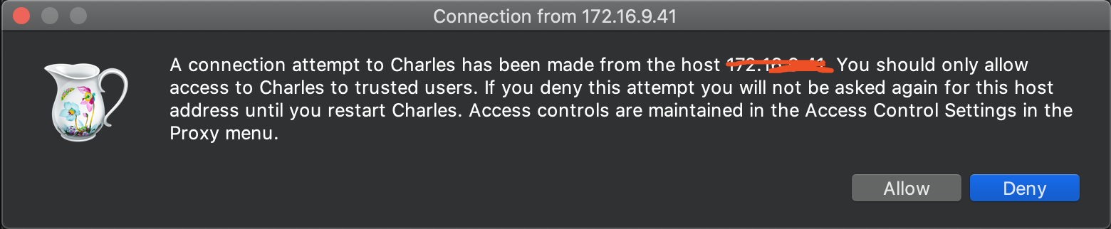 这个时候,电脑上 charles 会弹出一个提示框,大致意思就是是否允许接入,务必点击允许。否则后面的步骤你是无法进行下去的。