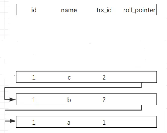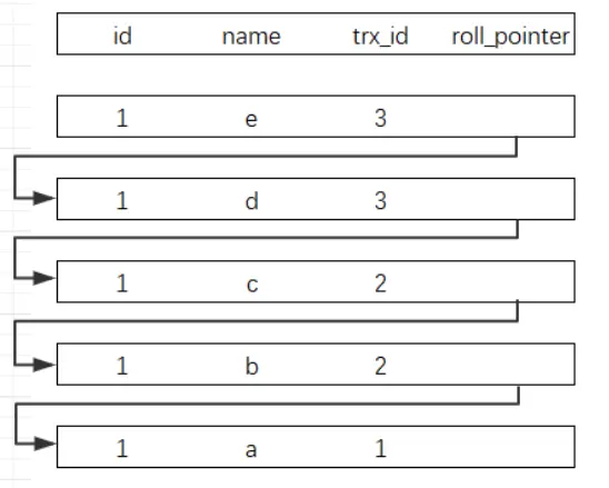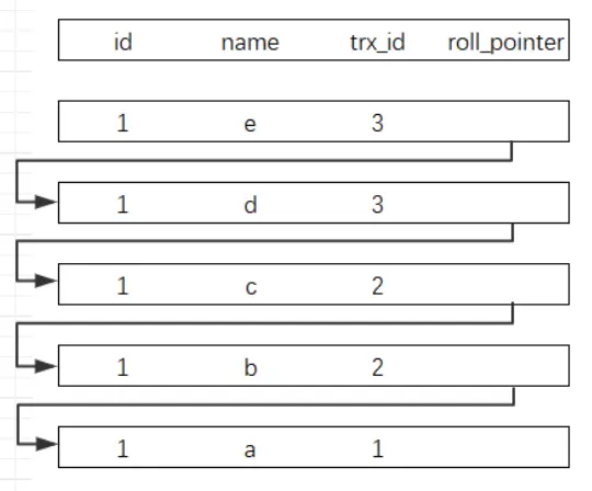 记录的每次更新,都会将旧值放入一条undo日志中,随着更新次数的增多,所有的版本都会被roll_pointer连接成一个链表,称之为版本链,版本链的头节点就是当前记录最新的值。