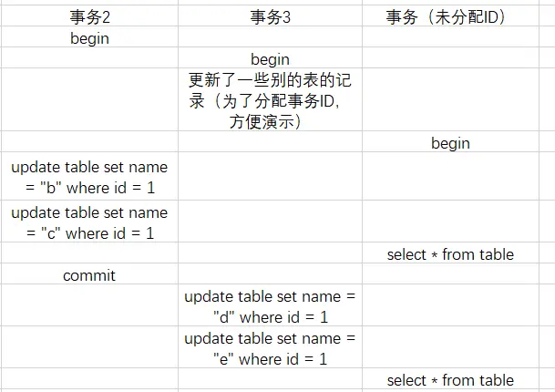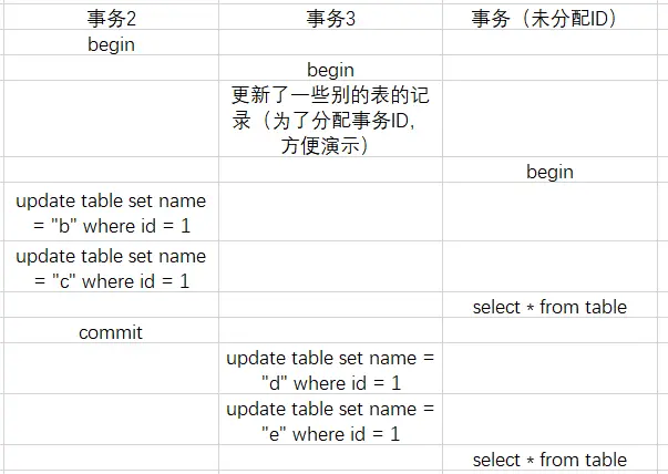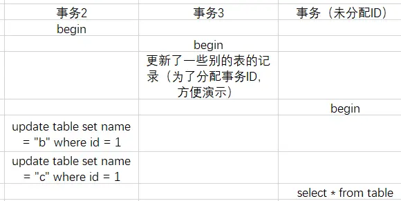 第三个事务进行第一个select时,m_ids = [2,3],min_trx_id=2,max_trx_id=4,creator_trx_id=0(因为现在只有读)。