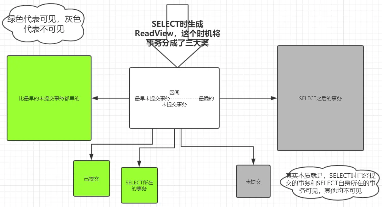 总结一下,其实很简单,可重复读时,第一次select生成ReadView,根据ReadView可见的规则,本事务Begin前的事务均可见,读取的时刻之后的事务均不可见,之间的事务如果是自己就可见,如果活跃(即select时其他事务还没提交)不可见,不活跃(select时其他事务已提交)可见。