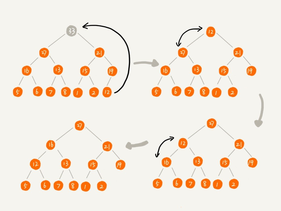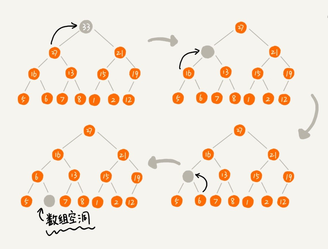 我们直到大小顶堆的根节点值是最大的或者最小的。那么如果删除了堆顶元素,接下来就要从左右子节点选个最大或者最小的放入到根节点,然后以此类推。那么我们按照我们刚才分析的如果进行移动的话,可能会产生数组的空洞。