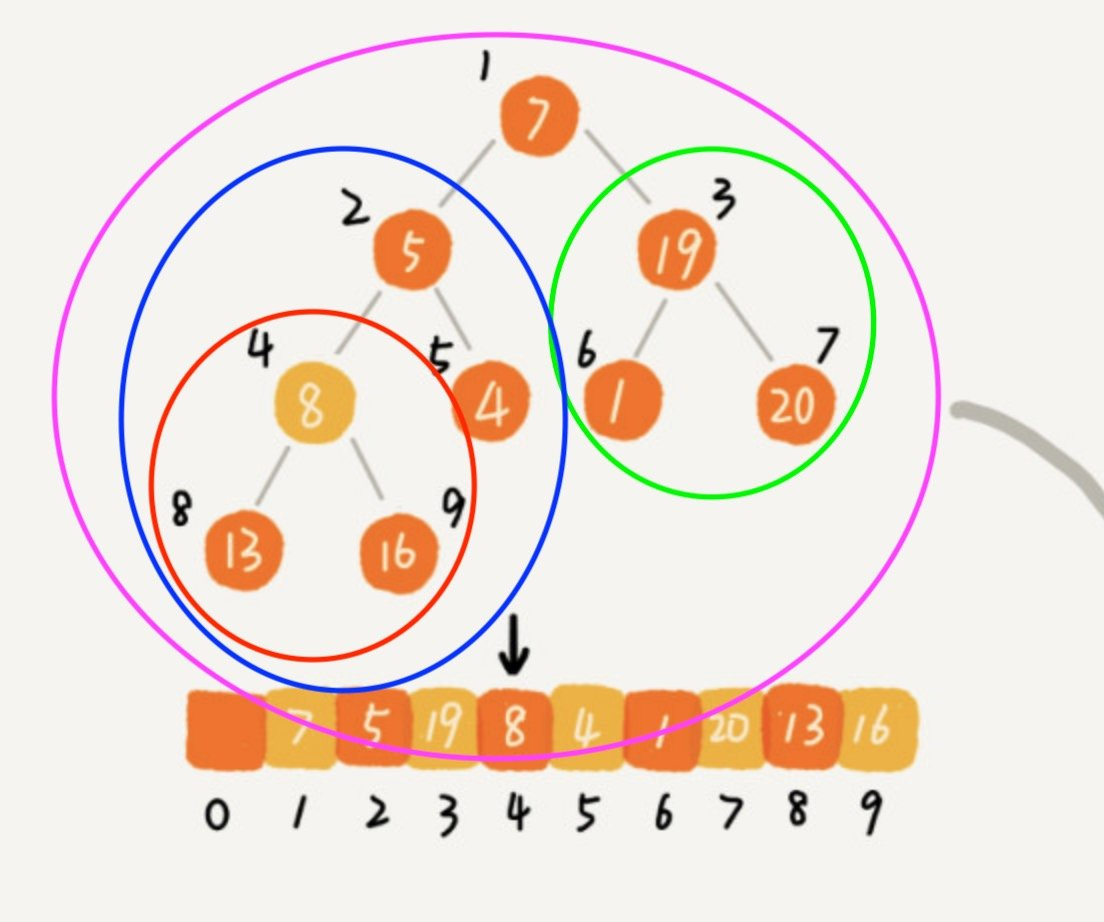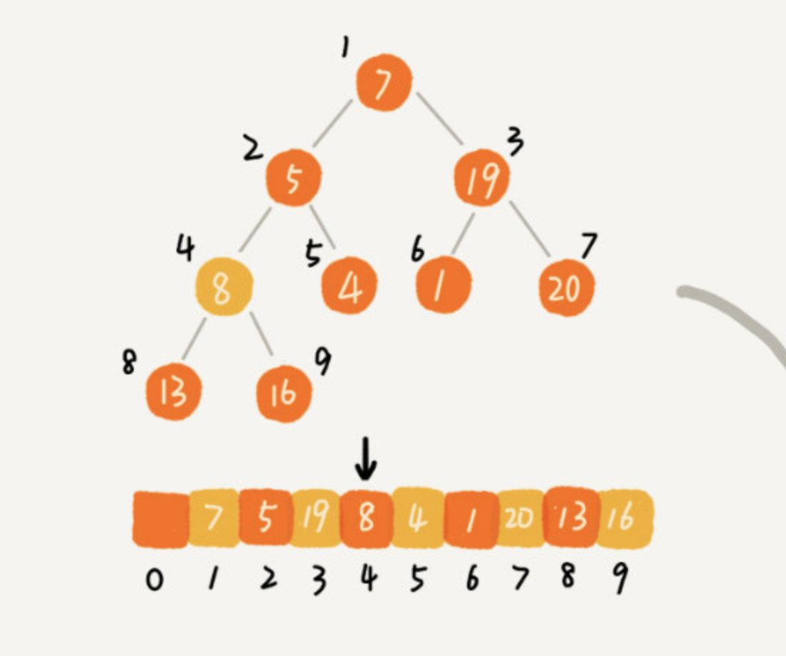 其中第 1 个和第 2 个是大顶堆,第 3 个是小顶堆,第 4 个不是堆。既然堆本质上是一个完全二叉树,那么我们完全可以用数组来存堆的数据。那么当前节点是n的话,其左子节点就是2n,其右子节点就是2n+1。