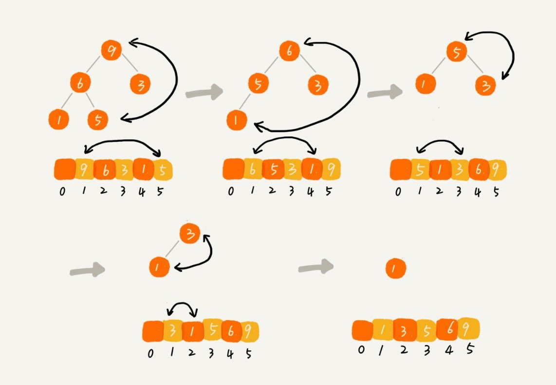 排序的话就简单了,因为堆的根节点是最大或者最小的元素,所以第一种我们依然能够想到的是直接将其根节点的值拿出来后放到另一个数组,然后删掉堆顶元素,然后再拿掉堆顶元素,然后再删除依次类推。这样有一个缺点还是占用内存,因为我们又重新定义了一个数组,那么有没有办法不占用内存,直接在原有的数组中进行排序呢?