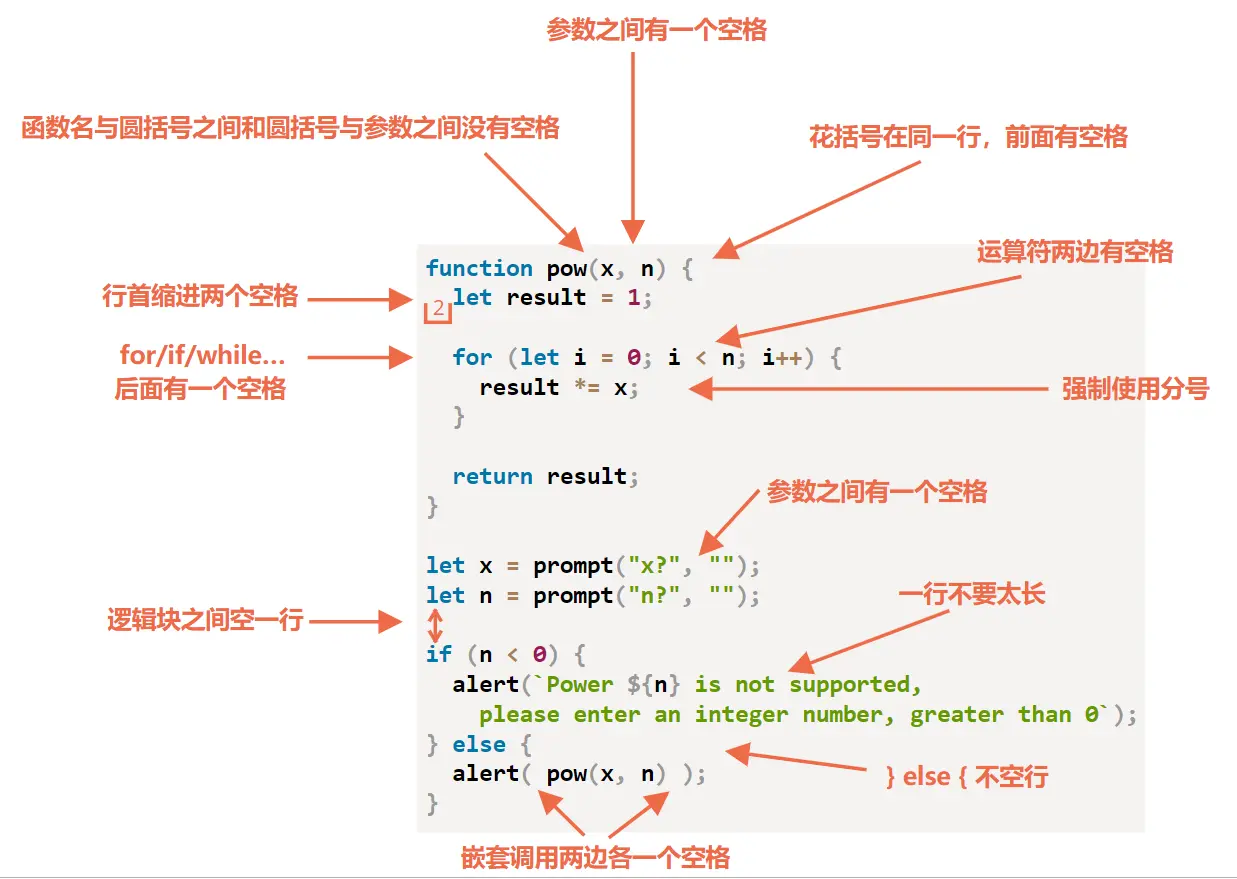 function pow(x, n) { let result = 1; // <-- for (let i = 0; i < n; i++) { result *= x; } // <-- return result; }插入一个额外的空行有助于使代码更具可读性。写代码时,不应该出现连续超过 9 行都没有被垂直分割的代码。