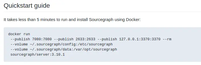 拿一个最近部署 Sourcegraph 的经历举个栗子,官方有个开发者 清单,一堆依赖和环境设置,照着这个部署会爆炸的,好在官方还提供了可快速部署的镜像,就是这么简单: