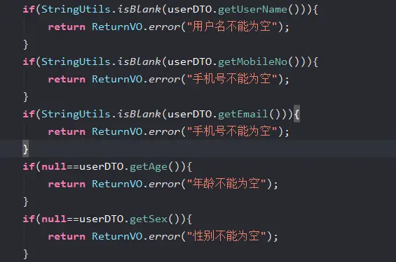 这个例子只是校验了一下空参数。如果需要验证邮箱格式和手机号格式校验的话代码会更多,所以介绍一下validator通过注解的方式进行校验参数。