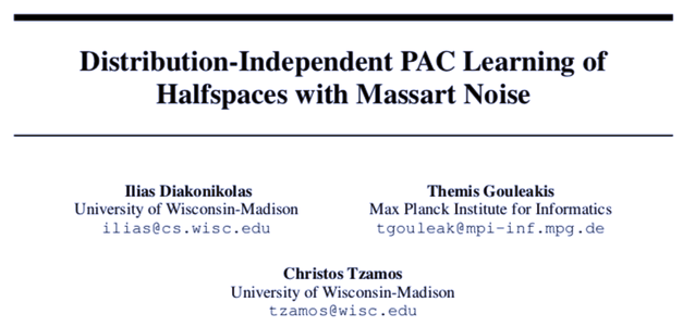 评语:这篇论文研究了线性阈方程(linear threshold function)在二分类的,有着未知的、有边界标签噪声训练数据的情况。它解决了一个非常基础且长期开放的问题,并提出了一个高效的算法用于学习。这是机器学习核心领域的长期开放的问题,而这篇论文做出了巨大的贡献。其贡献在于:在 Massart 噪声下高效地学习半空间(half-space)。举一个例子:在 1%Massart 噪声下,弱学习析取(误差率为 49%)也是开放的。该论文展示了如何高效地实现与