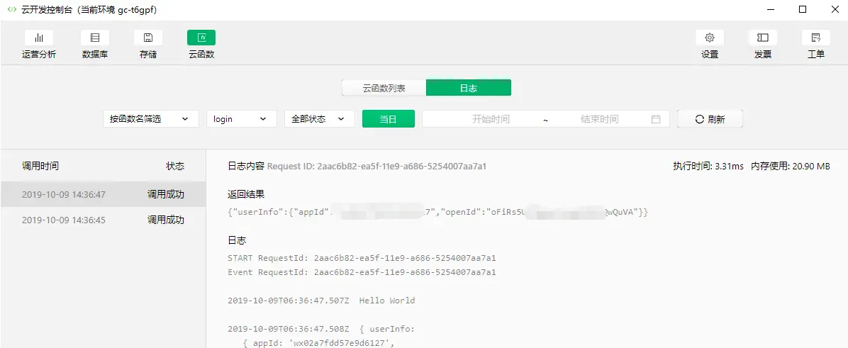 appid和openid,而不是传统的请求授权。整个过程不会与原有后台服务冲突。下面是调用login云函数获得的两个id。