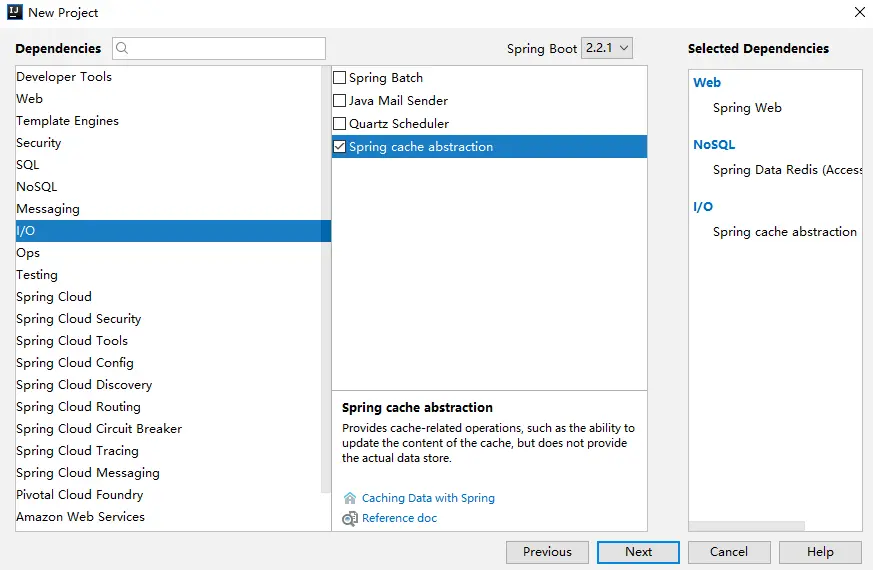 首先创建一个 Spring Boot 工程,注意创建的时候需要引入三个依赖, web、cache 以及 redis,如下图: