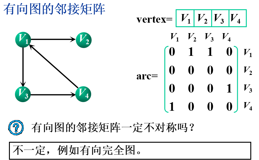 假设图G=(V,E)有n个顶点,则邻接矩阵是一个n×n的方阵,定义为: