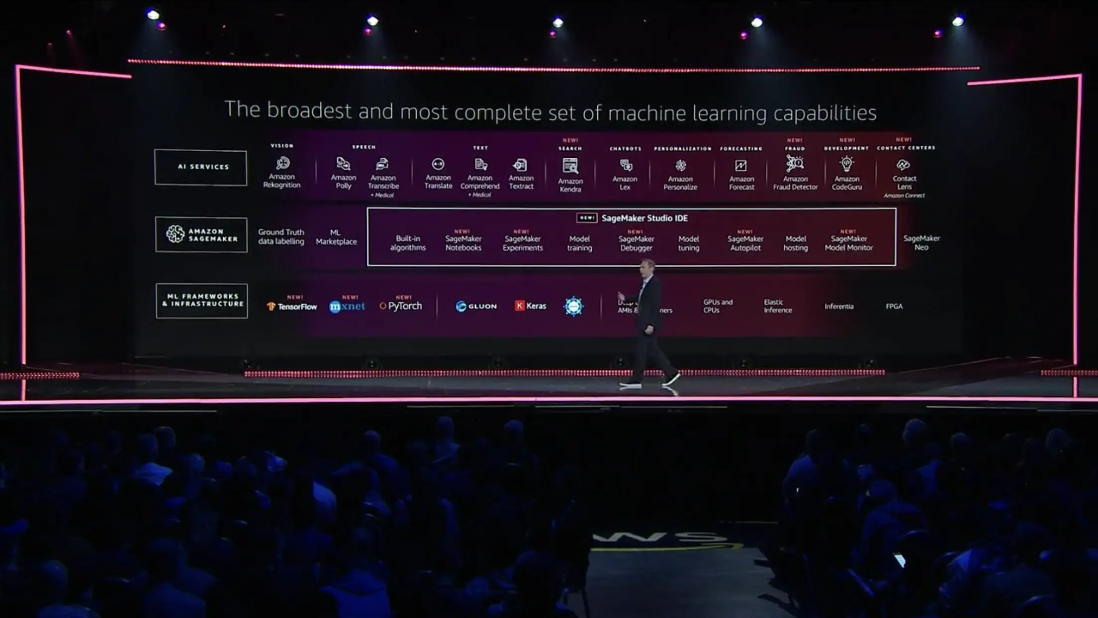Jassy 的另一个重大发布,是 SageMaker Studio。 它是一个基于网页的集成开发环境,可以完成 AI 用户的建模,训练,推理等需求。 通过它,用户可以直接与亚马逊云后端的 AI 微服务进行交互。 可见,亚马逊云现在不仅构建基础设施服务,而且还为业务用户提供方便使用此类服务的用户介面。
