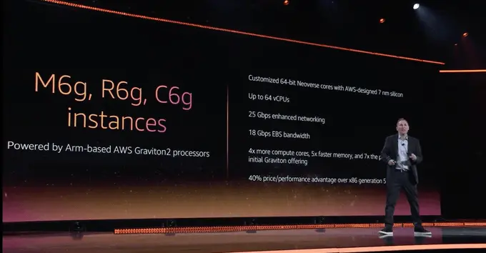 Graviton2 是基于 ARM 架构设计的 CPU。 与英特尔、 AMD 公司的 x86 cpu 相比,Graviton2 性能提高了40% ,成本降低了20% 。 它还为数据压缩的工作负载提供了硬件加速。