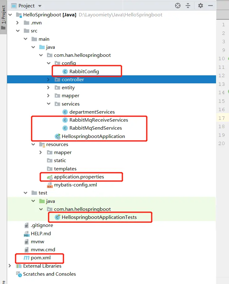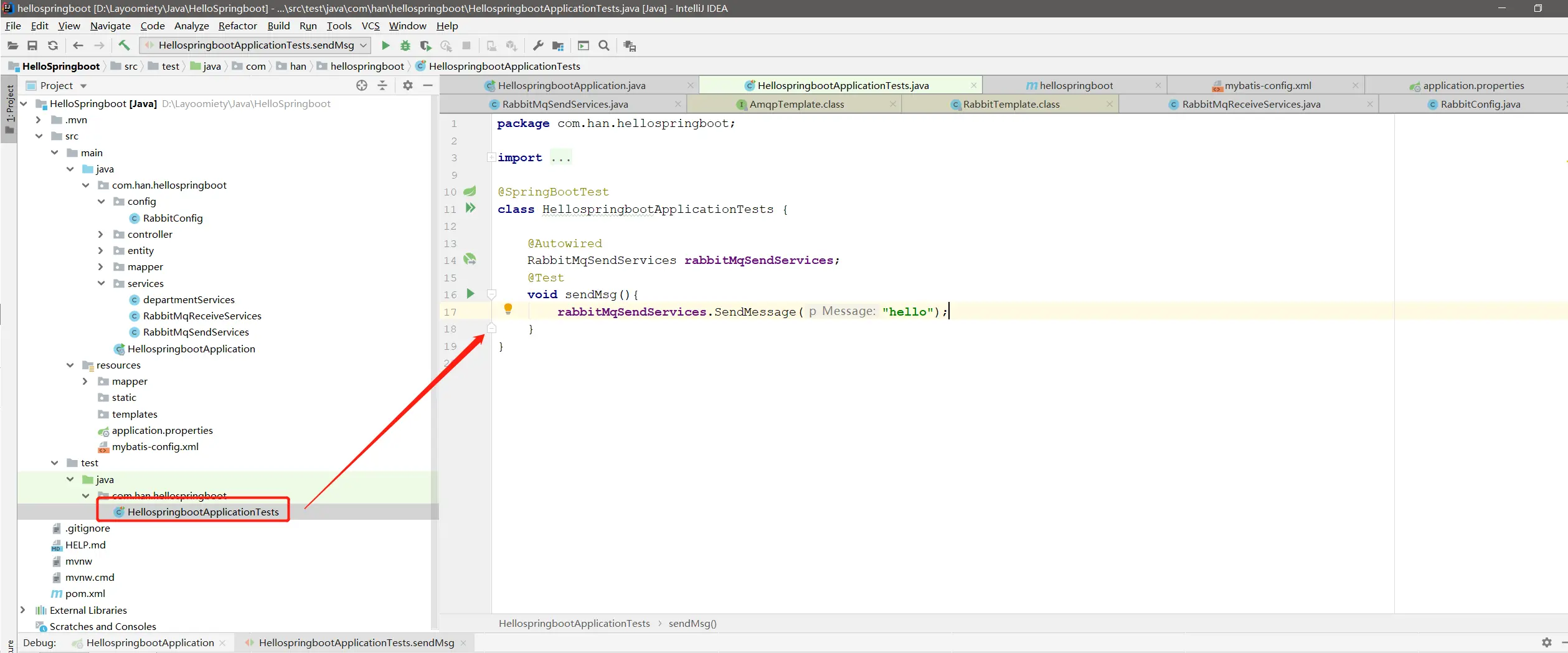 @RabbitListener(queues = "hello"),这里我刚开始学的时候看了网上的博客 都没有这个测试类很奇怪,也没说明,所以备注一下7.运行结果