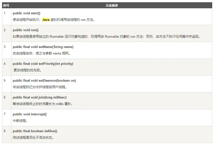 如下的ThreadClassDemo 程序演示了Thread类的一些方法: