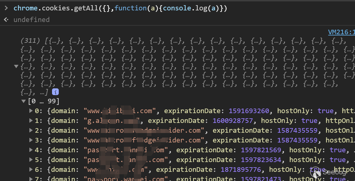 }当申请这样的权限之后,我们可以通过调用chrome.cookies去获取google.com域下的所有cookie.