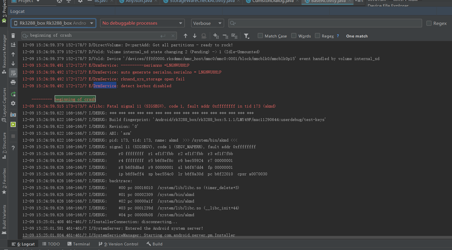 记录一个drmservice的底层空指针异常,目前还没解决 小叶不焦虑 2019-12-09 411 阅读1分钟 请看截图,程序跑着跑着就崩溃了,看到这个Fatal signal 11 (SIGSEGV),我就知道是底层c代码报了空指针,原因未知,这个页面相关的操作有打开相机,然后设置预览,方向就是往这个方向找了。目前还没解决,希望有缘人能帮我提供点思路如何解决这个崩溃。