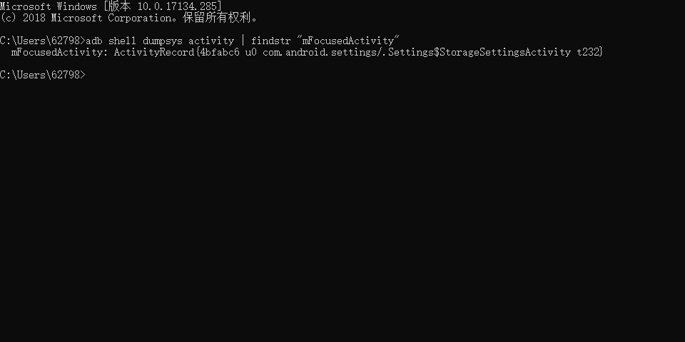 adb shell dumpsys activity | findstr "mFocusedActivity"