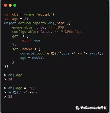 实现之前我们得先看一下Object.defineProperty的实现,因为vue主要是通过数据劫持来实现的,通过get、set来完成数据的读取和更新。