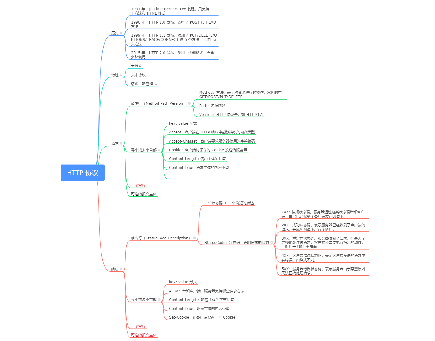 本文简单介绍了 HTTP 的发展简史、HTTP 请求和响应的格式,并且编写了第一个 Go Web 程序。作为整个互联网的基石,HTTP 协议的重要性怎么形容都不为过,是每个开发人员都必须掌握的知识。Go 语言的 net/http 为 Web 程序的开发封装了很多细节。使用它来开发 Web 程序非常简单。最后,为了能加深学习的印象,我画了一个脑图。期望学完之后能形成一个完整的知识体系。