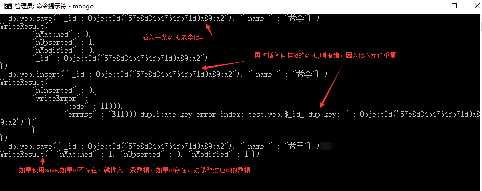 db.web.save({"name":"老李"}) 创建了名为web的集合,并新增了一{"name":"老李"}的数据 db.web.insert({"name":"ghost","age":10}) 在web集合中插入一条新的数据,如果没有web这个集合,mongodb会自动创建 save()和insert()也存在着些许区别: 若新增的数据主键已经存在,insert()会不做操作并提示错误,而save()则更改原来的内容为新内容。 _id是主键,主键是每条数据的唯一标识,不能重复,就像身份证是每个人的编号一样。 存在数据:{ id : ObjectId("57e8d34b4764fb71d0a89caa"), " name " : " 老李"} ,id是主键 insert({ _id : ObjectId("57e8d34b4764fb71d0a89caa"), " name " : " 老王 " }) 会提示错误