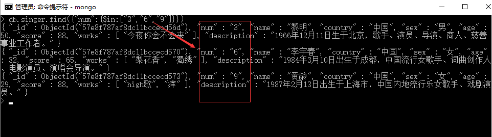 语法9:db.collection.find({ "key" : { $in: [ 1, 2, 3 ] } }) 属于