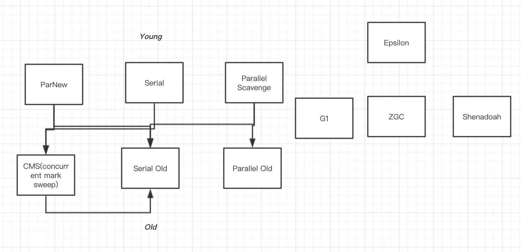 在进行gc turning (gc调优)时,会对jvm设置垃圾收集器的组合。jvm有内存分代模型,用于分代垃圾回收算法,分为Eden区,s1(幸存区,标记复制算法执行),s2区,old区,比例1.8中,Young(包括Eden,s1,s2称为young区)和 old(老年区)默认比例为1:2,young区中Eden和s1,s2的默认比例为8:1:1。