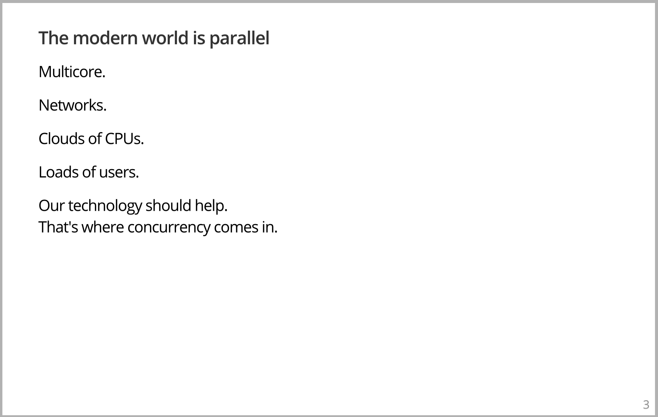 如果你看看今天的编程语言,可能会发现这个世界是面向对象的,但实际上并非如此,世界是并行的。你通过网络等等,从最底层(例如:多核计算机)获取所有的东西,一路攀升到了解星球、宇宙。世界上所有的东西都在同时发生,但我们拥有的计算工具实际上并不擅长表达这种世界观。看起来似乎是一种失败,如果我们了解什么是并发性,以及如何使用它,就可以解决这个问题。