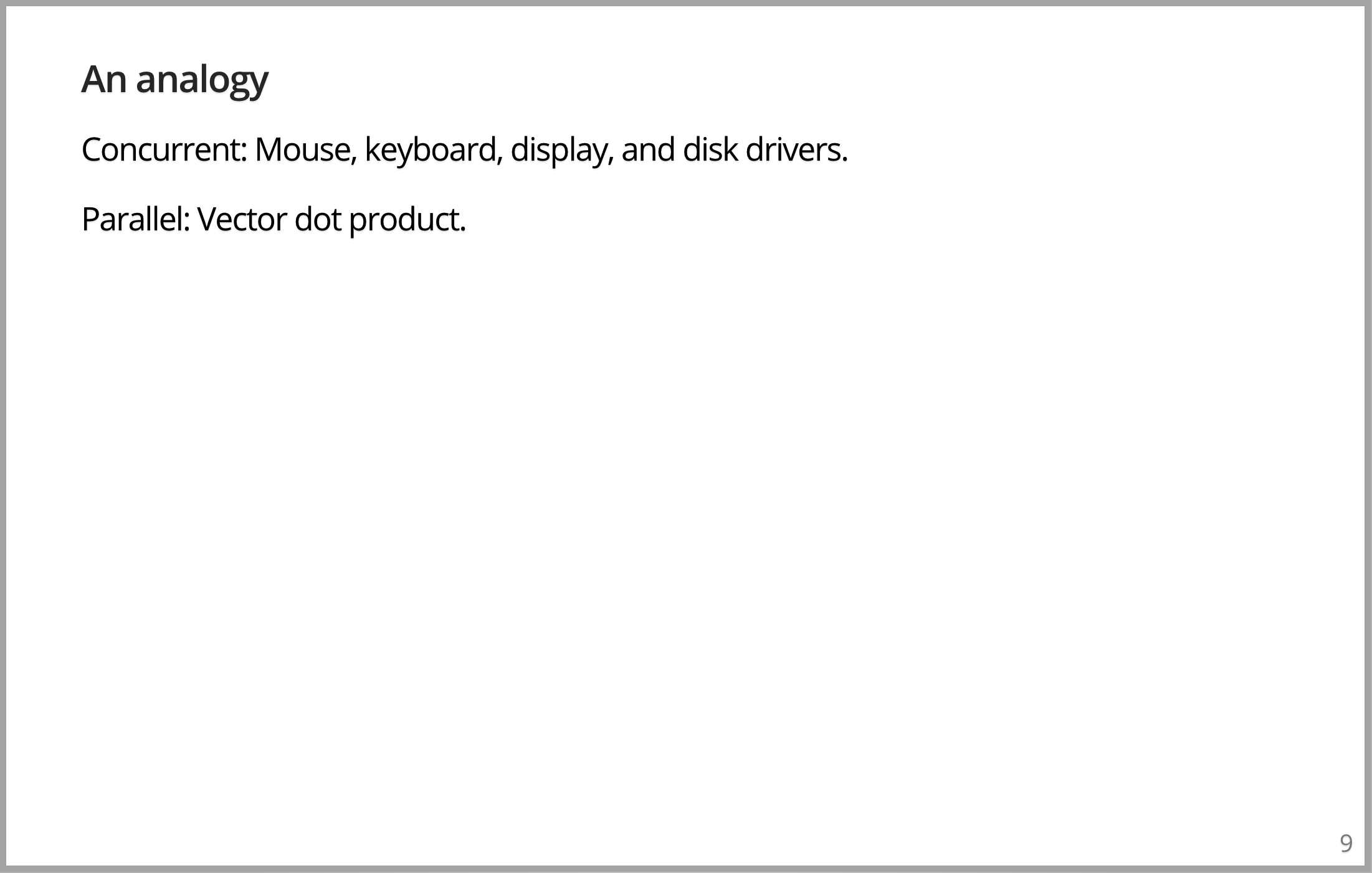 如果你在运行一个操作系统的话,会很熟悉的一个类比。操作系统可能有鼠标驱动程序、键盘驱动程序、显示驱动程序、网络驱动程序等等,都是由操作系统管理的,内核中的独立事物。它们都是并发的事物,却不一定是并行的。如果只有一个处理器,同一时间其中只有一个处于运行。I/O 设备具有一个并发模型,但本质不是并行的,它不需要是并行的。并行的事物可能类似向量点积,可以分解为微观操作,以使得可以在一些精美的计算机上并行执行。非常不同的概念,完全不是同一个东西。