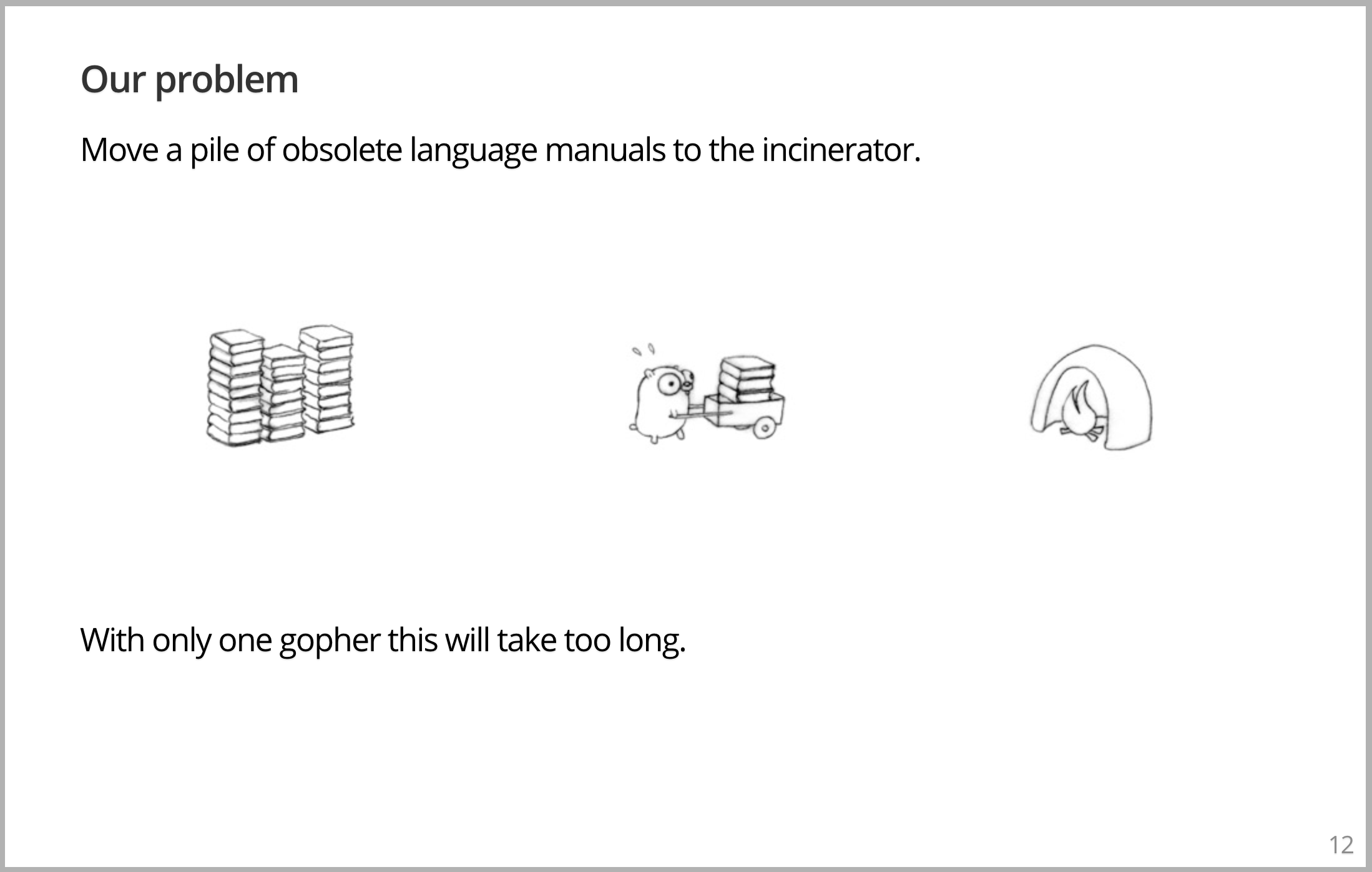 有一个真正的问题我们要解决。有一堆过时的手册,可以是 C++98 手册,现在已经是 C++11;或许是 C++11 书籍,但不再需要了。关键是我们想要清理掉它们,它们占用了大量空间。所以我们的 Gopher 有一个任务,把书从书堆里取出来,放到焚化炉里清理掉。但是,如果是一大堆书,只有一个 Gopher 需要很长时间。Gopher 也不擅长搬运书籍,尽管我们提供了小车。