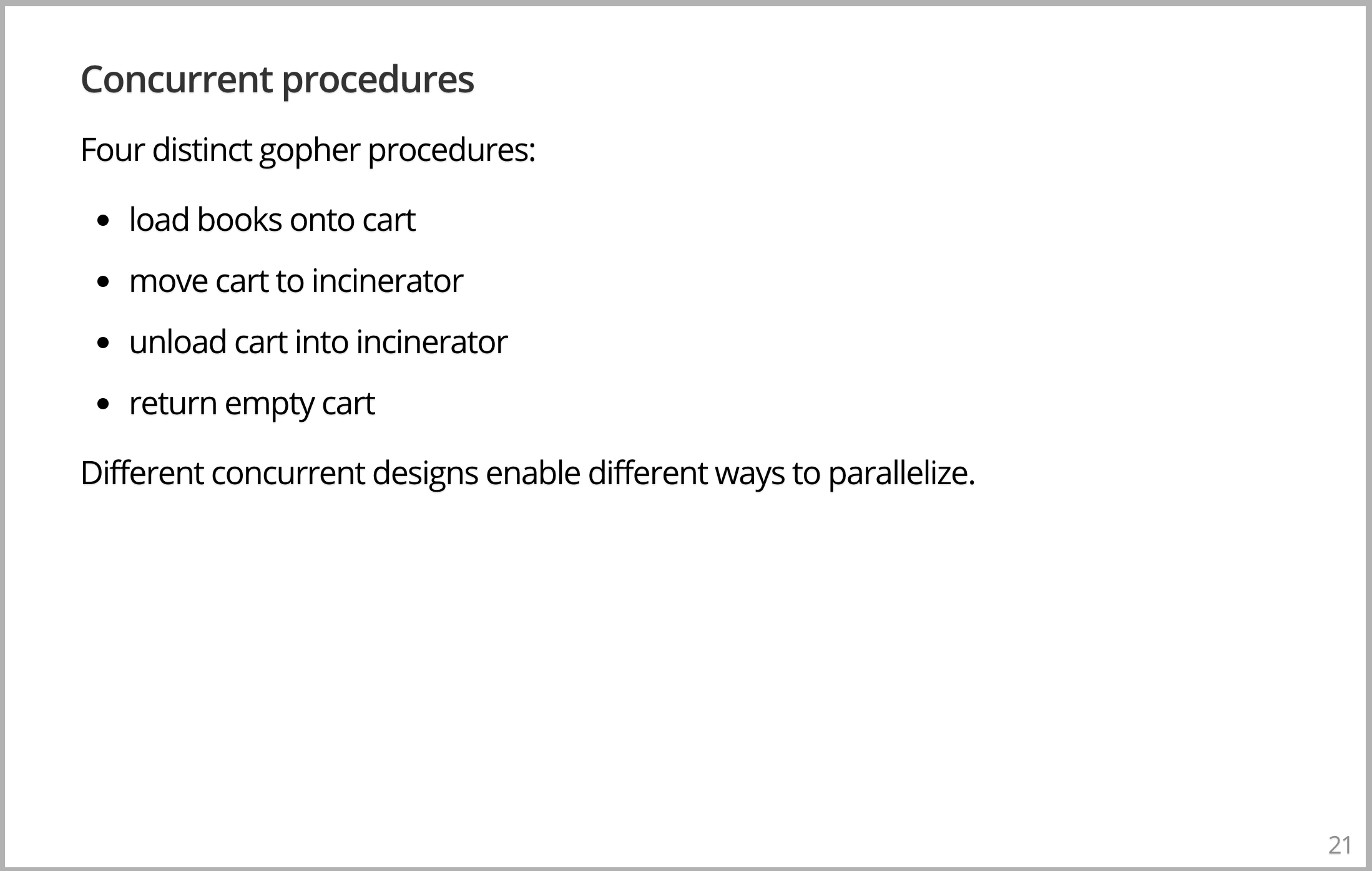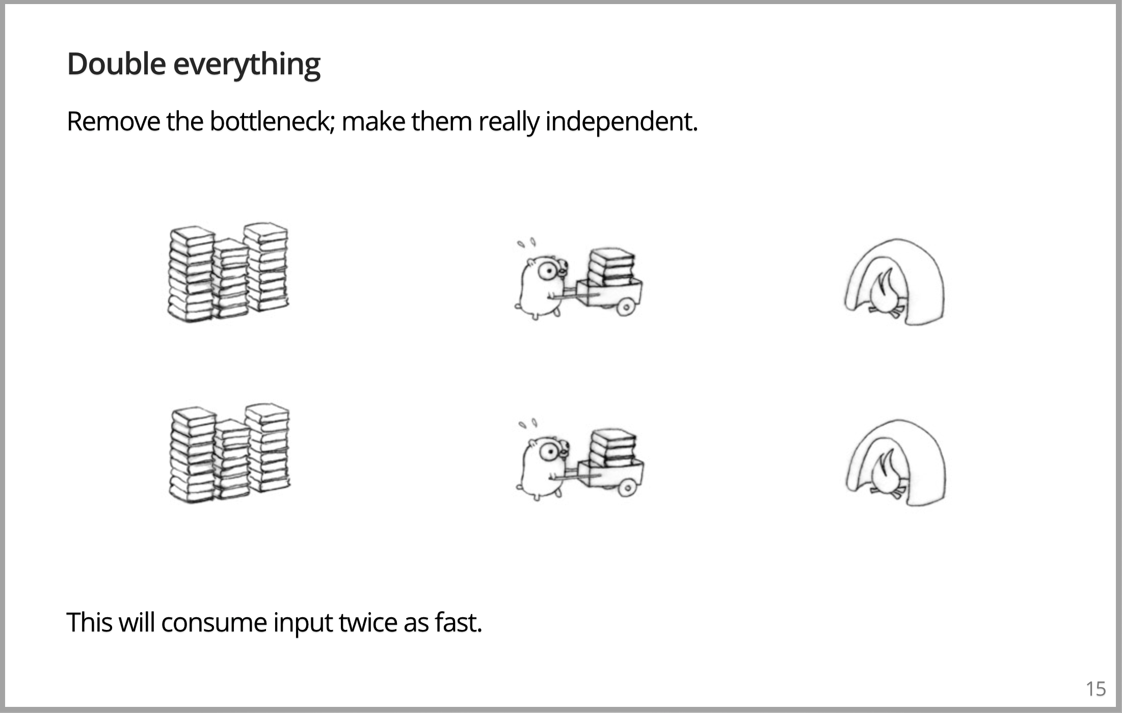 如何让它们搬运得更快,我们把一切都增加一倍。我们提供两个 Gopher,把书堆,焚化炉和 Gopher 一样也增加一倍。现在我们可以在相同的时间里搬运两倍的书,这是并行,对吧?
