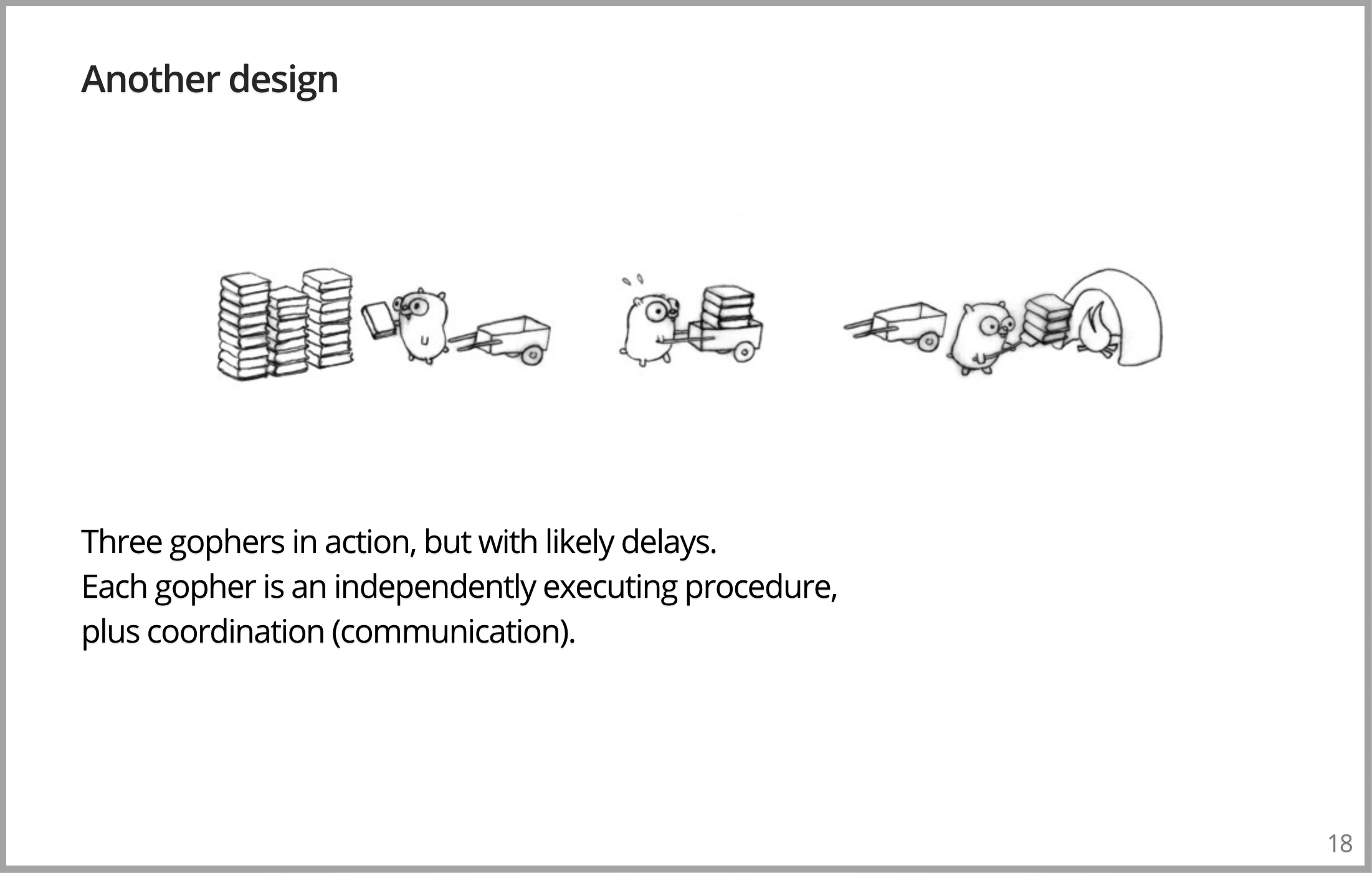让我们处理下这个问题,另外增加一个Gopher归还空车,这明显很傻。但我想指出一个相当深刻的问题,这个版本的问题实际上会比之前版本的问题执行得更好。尽管为了完成更多的工作,增加了一个 Gopher 来回奔波。因此,一旦我们理解了并发性的概念,就可以向图片增加 Gopher,真的可以做更多的工作,使之运行得更快。因为管理的更好的块的并发组合真的可以运行得更快。工作可能不会恰好完美地进行,但是可以想象如果所有的 Gopher 的时间都恰到好处,它们知道每次搬运多少书。并发组合真的可以让4个 Gopher 都一直在忙碌。事实上,此版本可能比原来的版本快四倍。虽然可能性不大,但是我想让你理解,是可能的。
