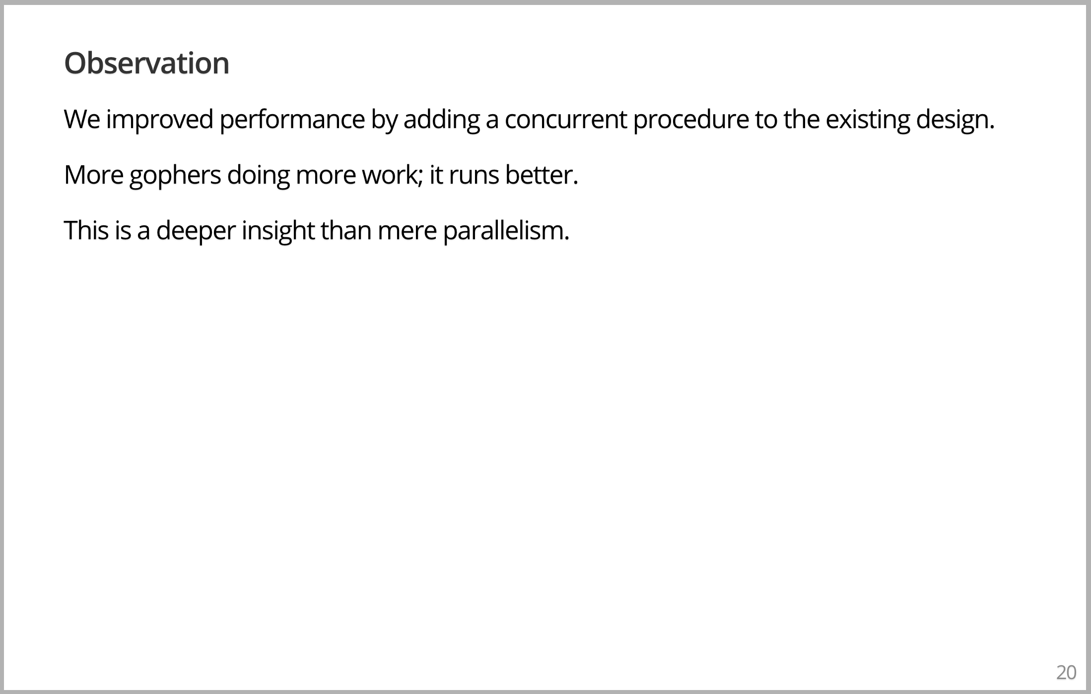 此时有一个发现,它非常重要而且很微妙,有些柔性。我们在现有的设计中通过添加并发程序来提高程序的性能。我们真的添加了更多的东西,整个过程变得更快了。如果仔细想想,有点奇怪,也有点不奇怪。因为额外添加了一个 Gopher,而且 Gopher 确实工作。但是如果你忘记了它是个 Gopher 的事实,并认为只是增加了东西,设计确实可以使它更高效。并行性可以出自于对问题更好的并发表达,这是一个相当深刻的见解。因为 Gopher 们的参与所以看起来不像。但是没关系。