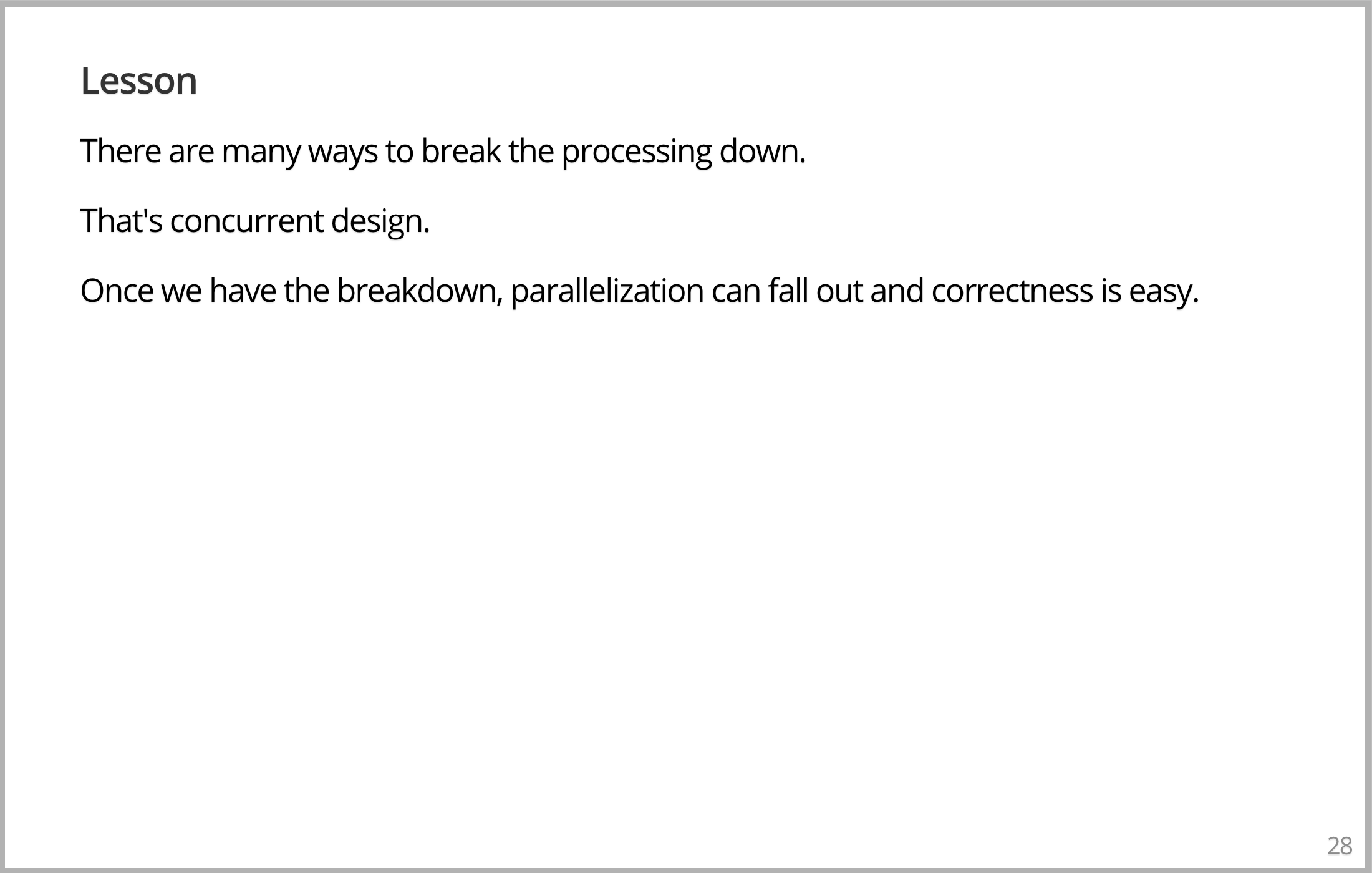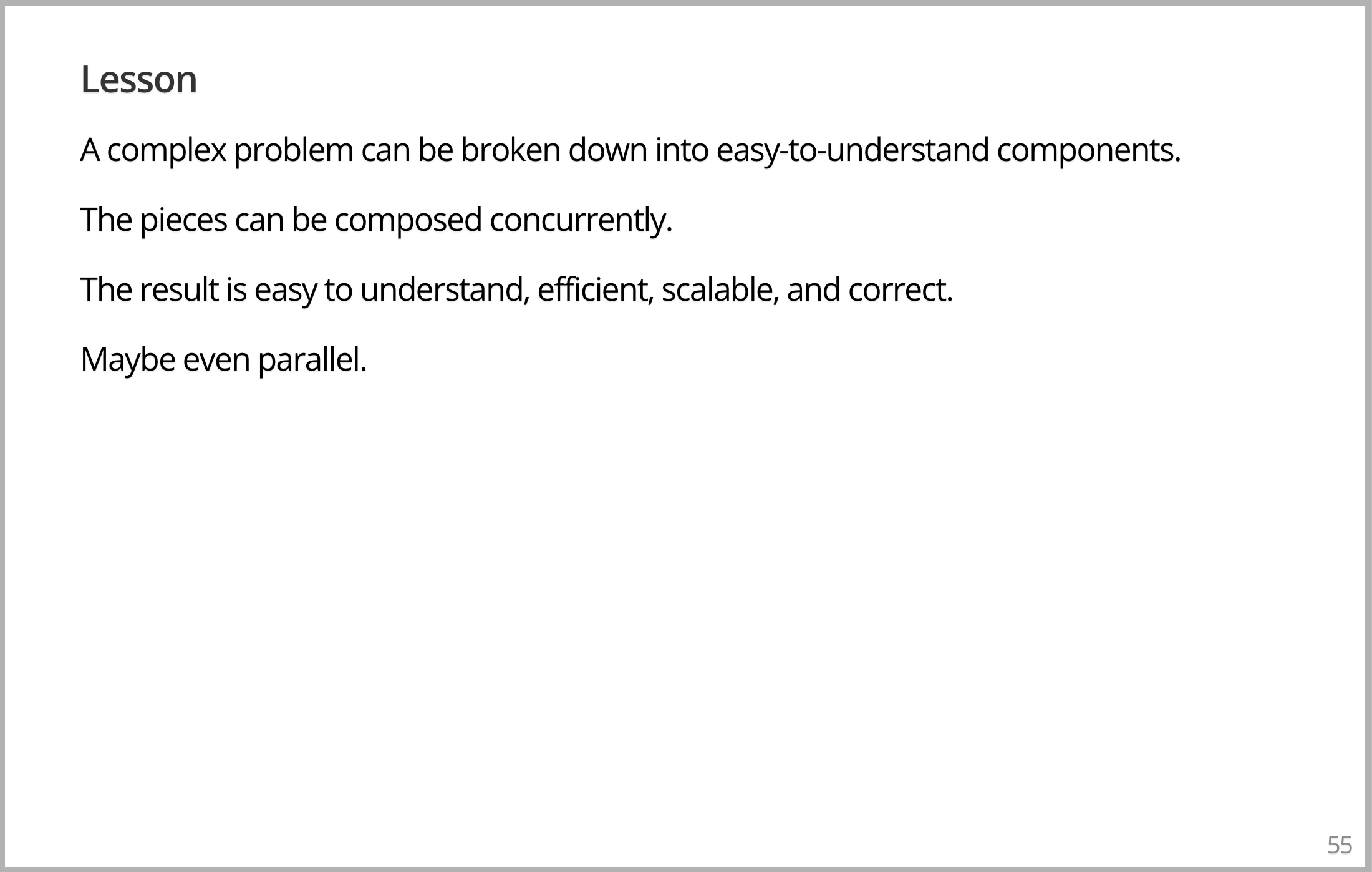 还要注意,没有锁了,没有互斥锁了,所有这些都是在考虑旧的并发模型时需要考虑的,新模型没有了,你看不到它们的存在。然而,一个正确的无锁的并发、并行算法,一定很好,对吧?